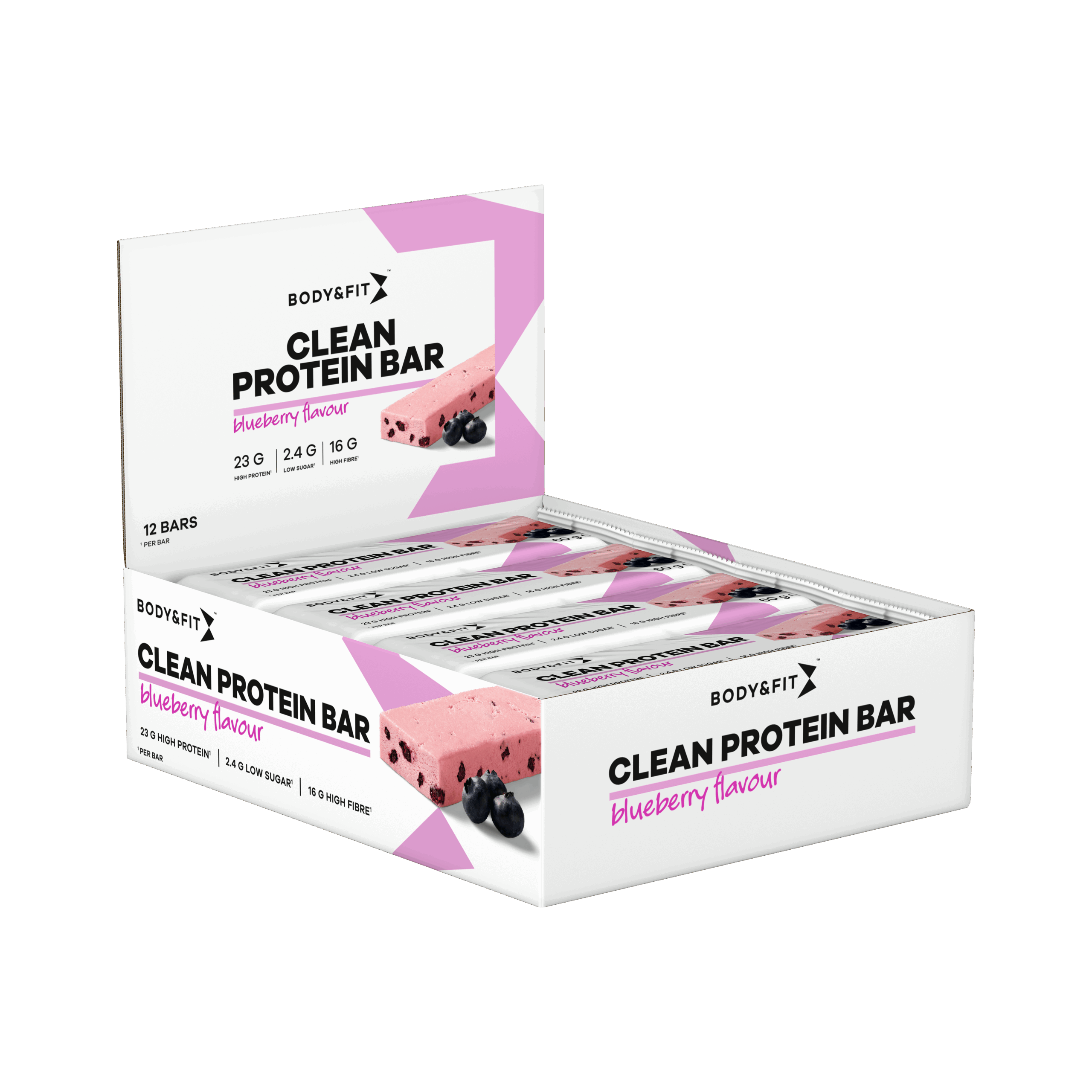 Productomschrijving Op zoek naar een eiwitreep met minder koolhydraten* en zonder toegevoegde suikers**? De Clean Protein Bar van Body&Fit heeft alles wat je zoekt. Geen coating, geen onnodige toevoegingen, maar wel boordevol smaak. Clean Protein Bar: wat is het? De Body&Fit Clean Protein Bar is een favoriet onder sporters en iedereen met een actieve leefstijl. Een reep bevat 21 gram hoogwaardig eiwit. Het product bevat geen toegevoegde suikers** en is gezoet met onder andere stevia-extract – een natuurlijke zoetstof zonder calorieën. Ideaal voor als je op je voeding wilt letten, zonder in te leveren op smaak! Wanneer kun je Clean Protein Bar nemen? De Clean Protein Bar is een heerlijk en makkelijk tussendoortje. Perfect om te gebruiken na het sporten, want eiwitten ondersteunen snel herstel van je spieren na je training. Ook ideaal om mee te nemen naar de sportschool of voor onderweg. Onze Clean Protein Bar is de ideale keuze voor iedereen die extra eiwitten wil binnenkrijgen zonder