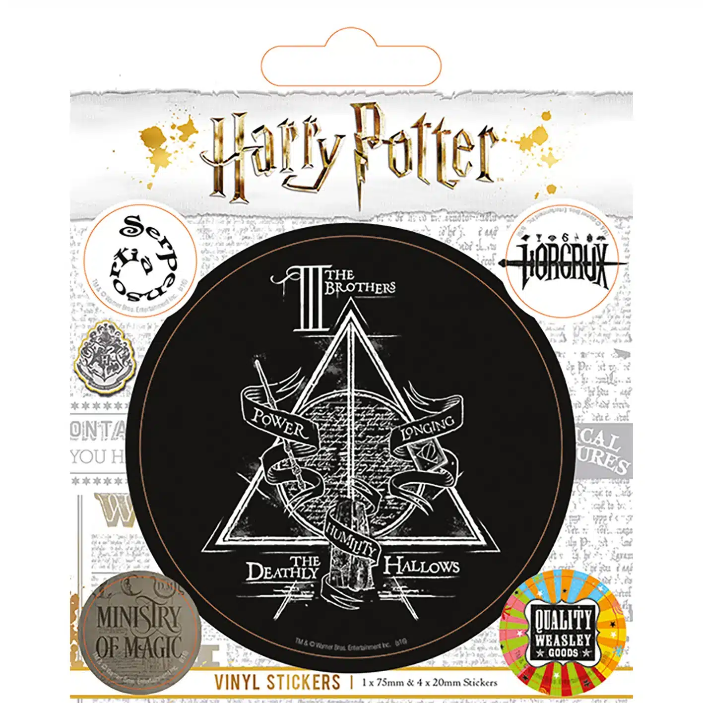Harry Potter Symbols Vinyl Sticker, 5 stickers op 1 vel.Leuk om overal op te plakken en ook leuk om als cadeau weg te geven aan een echte Harry Potter fan.1 sticker van 7,5 cm doorsnee en 4 stickers van 2 cm doorsnee.