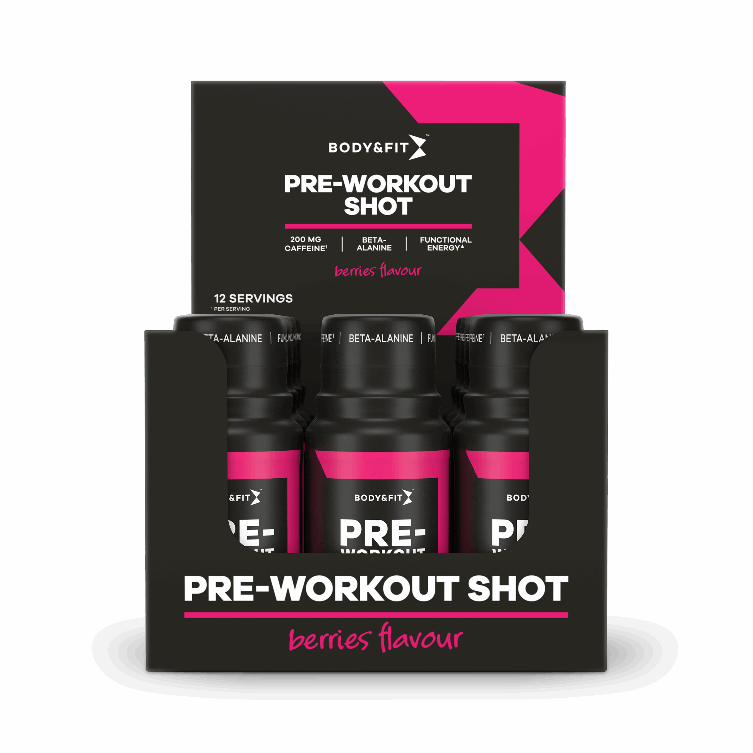 Kant en klare Pre-Workout shot van Body & Fit! Op zoek naar een nieuwe Pre-Workout shot? Wij hebben ‘m voor je! De Pre-Workout shot van Body & Fit bevat alleen zorgvuldig geselecteerde ingredienten. Met deze shot krijg je meteen 200mg cafeïne, evenals de lichaamseigen aminozuur beta-alanine binnen. Daarnaast bevat deze pre-workout vitamine B6, wat een bijdrage levert aan de energievoorziening in spieren tijdens een training. Deze shot kan zowel voor een krachttraining als voor een duursporttraining gedronken worden. Zin om te knallen tijdens je volgende workout? Drink voor je training één shot en dan ben je er helemaal klaar voor! En goed nieuws: deze pre-workout is volledig suikervrij. Cafeïne verbetert de fysieke en mentale prestaties Cafeïne is een van de meest populaire pre-workout ingredienten, omdat het helpt de concentratie en focus te verbeteren*. Met wel 200mg cafeïne per shot is dit een fijne shot om te gebruiken voor jouw workout. *Claim in afwachting van Europese