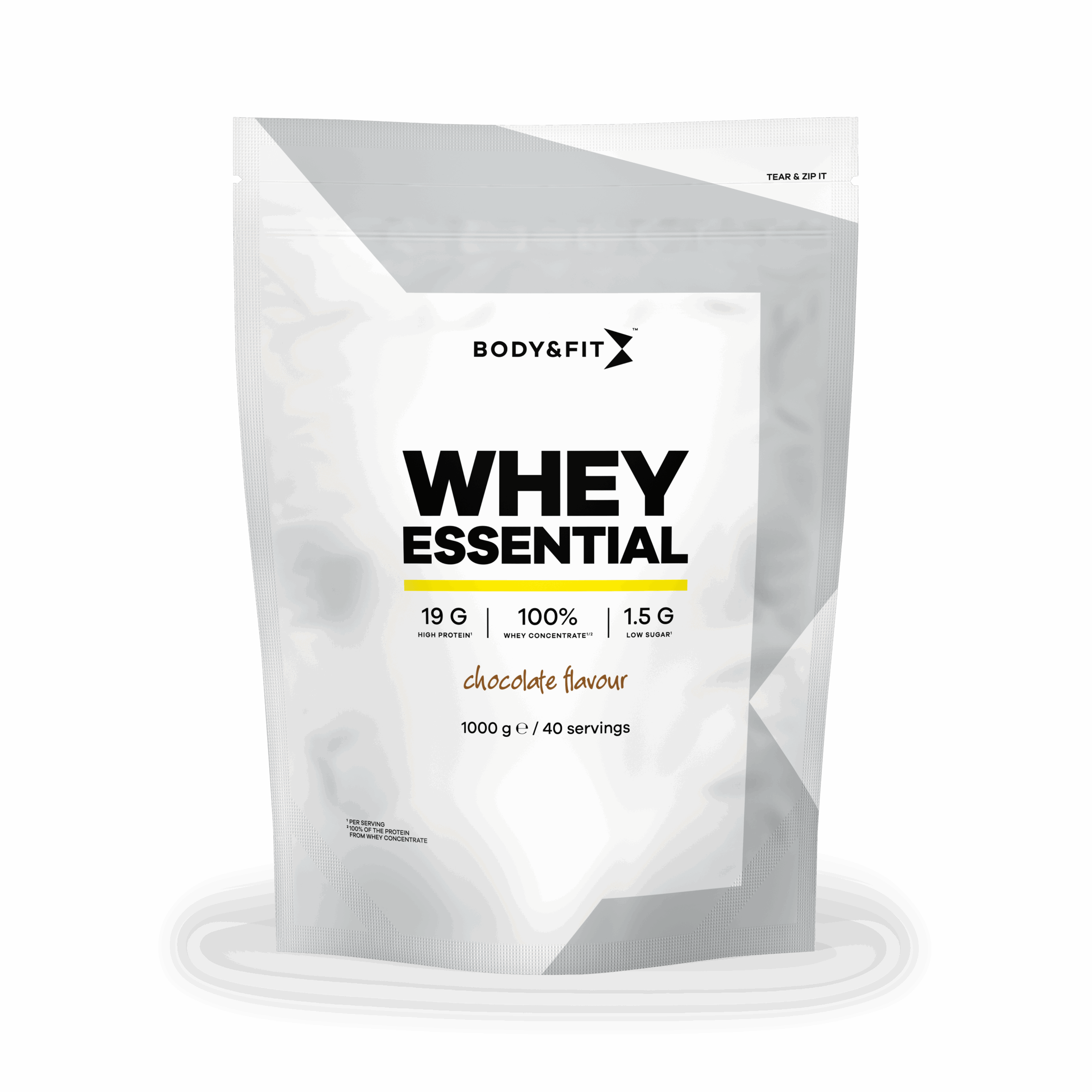 Ben je op zoek naar een no-nonsense wei-eiwitpoeder? Kies dan voor Body&Fit Whey Essential. Hét eiwitpoeder voor sporters en iedereen met een actieve leefstijl. Whey Essential: wat is het? Whey Essential is een eiwitpoeder met 100% wei-eiwit contentraat. Wei-eiwit wordt gemaakt van melk en is erg populair onder sporters. Eiwitten dragen namelijk bij aan de groei en instandhouding van spiermassa. Verder ondersteunen eiwitten snel herstel van je spieren na je training. Er zijn verschillende soorten wei-eiwit. Wei-eiwit concentraat is de minst bewerkte vorm (minder bewerkt dan bijvoorbeeld isolaat of hydrolysaat). Daardoor heeft het een romige textuur en vinden veel mensen het lekkerder smaken dan andere soorten. Hoe gebruik je Whey Essential? Whey Essential kun je gebruiken in je eiwitshake of smoothie. Die kun je nemen na het sporten of verspreid over de dag. Je kunt Whey Essential ook toevoegen aan je bakje yoghurt, havermout of bakrecepten zoals pannenkoeken, bananenbrood of koekjes.