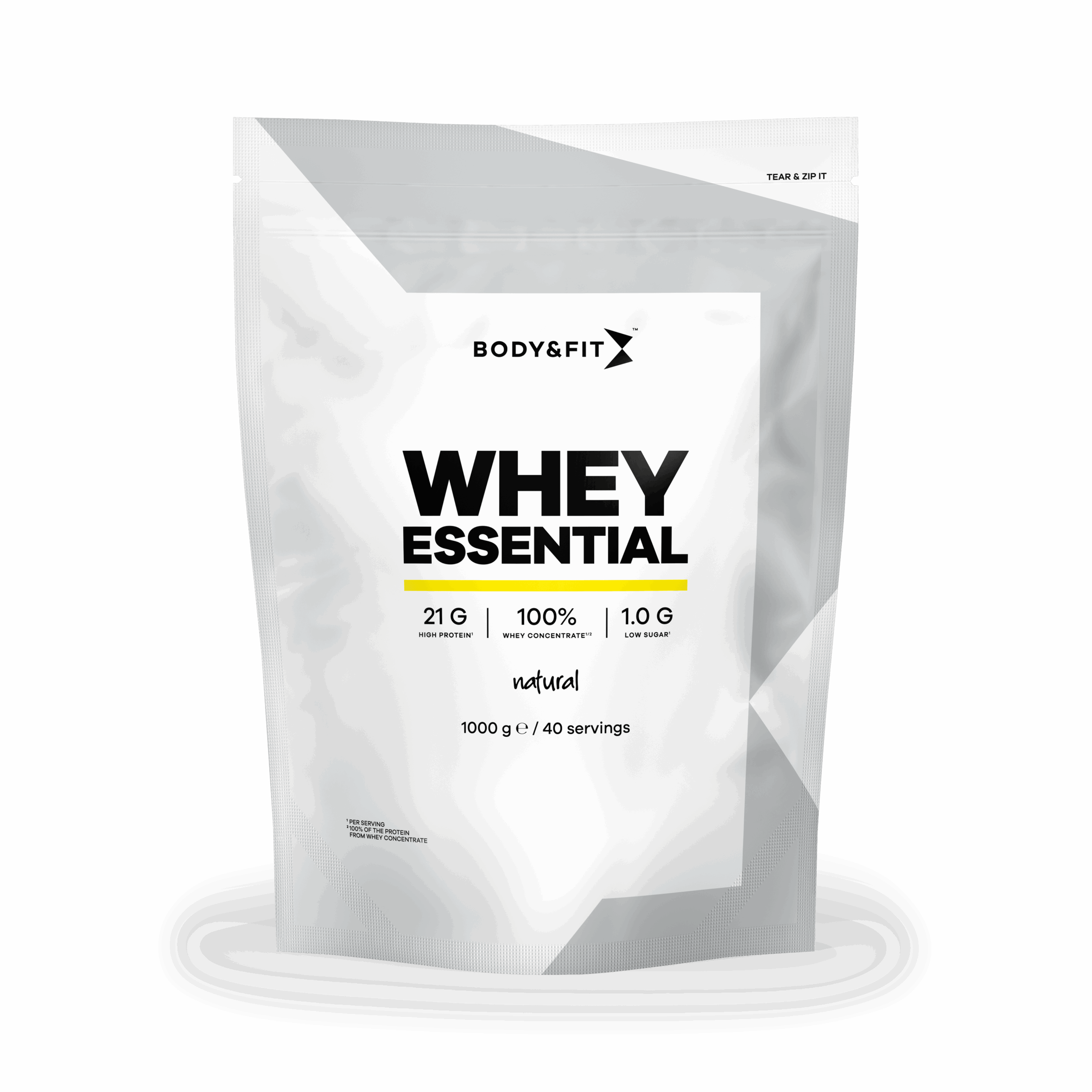 Ben je op zoek naar een no-nonsense wei-eiwitpoeder? Kies dan voor Body&Fit Whey Essential. Hét eiwitpoeder voor sporters en iedereen met een actieve leefstijl. Whey Essential: wat is het? Whey Essential is een eiwitpoeder met 100% wei-eiwit contentraat. Wei-eiwit wordt gemaakt van melk en is erg populair onder sporters. Eiwitten dragen namelijk bij aan de groei en instandhouding van spiermassa. Verder ondersteunen eiwitten snel herstel van je spieren na je training. Er zijn verschillende soorten wei-eiwit. Wei-eiwit concentraat is de minst bewerkte vorm (minder bewerkt dan bijvoorbeeld isolaat of hydrolysaat). Daardoor heeft het een romige textuur en vinden veel mensen het lekkerder smaken dan andere soorten. Hoe gebruik je Whey Essential? Whey Essential kun je gebruiken in je eiwitshake of smoothie. Die kun je nemen na het sporten of verspreid over de dag. Je kunt Whey Essential ook toevoegen aan je bakje yoghurt, havermout of bakrecepten zoals pannenkoeken, bananenbrood of koekjes.