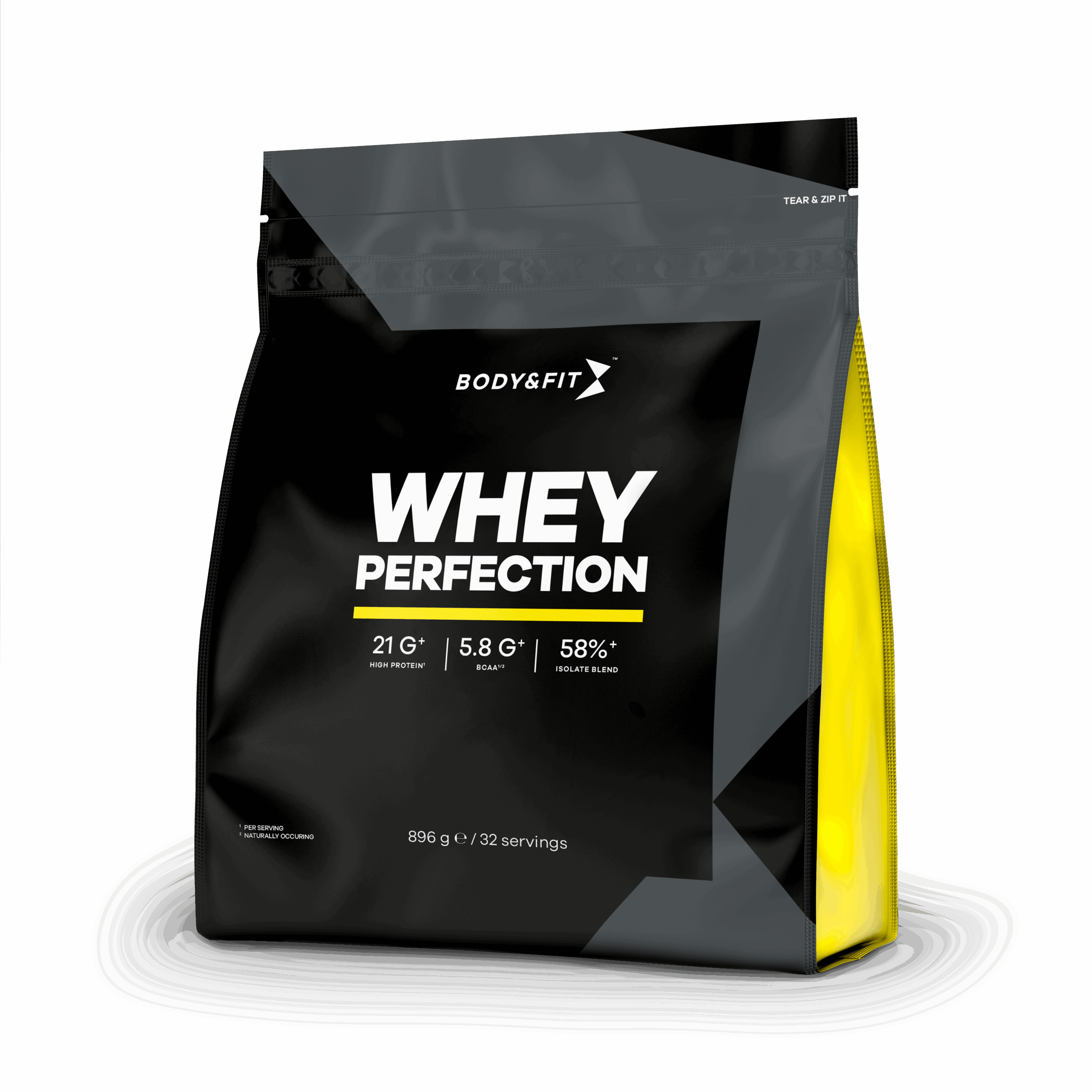 Dit product is uitgesloten van kortingen en kortingscodes tenzij anders vermeld Body&Fit Whey Perfection – Body&Fit’s #1 bestseller De favoriet onder sporters: Whey Perfection! Ondersteun je spiergroei met tot wel  23 gram pure en hoogwaardige eiwitten per shake. Whey Perfection: wat is het? Whey Perfection is de perfecte eiwitshake voor sporters. Met ongeveer 100 calorieën per portie, laag in suikers, krijg je alle voordelen zonder onnodige toevoegingen. De shake bevat een unieke combinatie van drie hoogwaardige bronnen van wei-eiwit: isolaat, concentraat en hydrolysaat. Meer dan 50% daarvan is wei-eiwit isolaat, een geconcentreerde vorm met een eiwitgehalte van 85%. Wanneer gebruik je Whey Perfection? Het beste moment om Whey Perfection te nemen? Direct na je workout. Eiwitten helpen je spieren te herstellen na je training. Maar je kunt het ook prima gebruiken als snack of verspreid over de dag. Hoe maak je de perfecte shake? Voeg het poeder toe, even schudden, en klaar is je